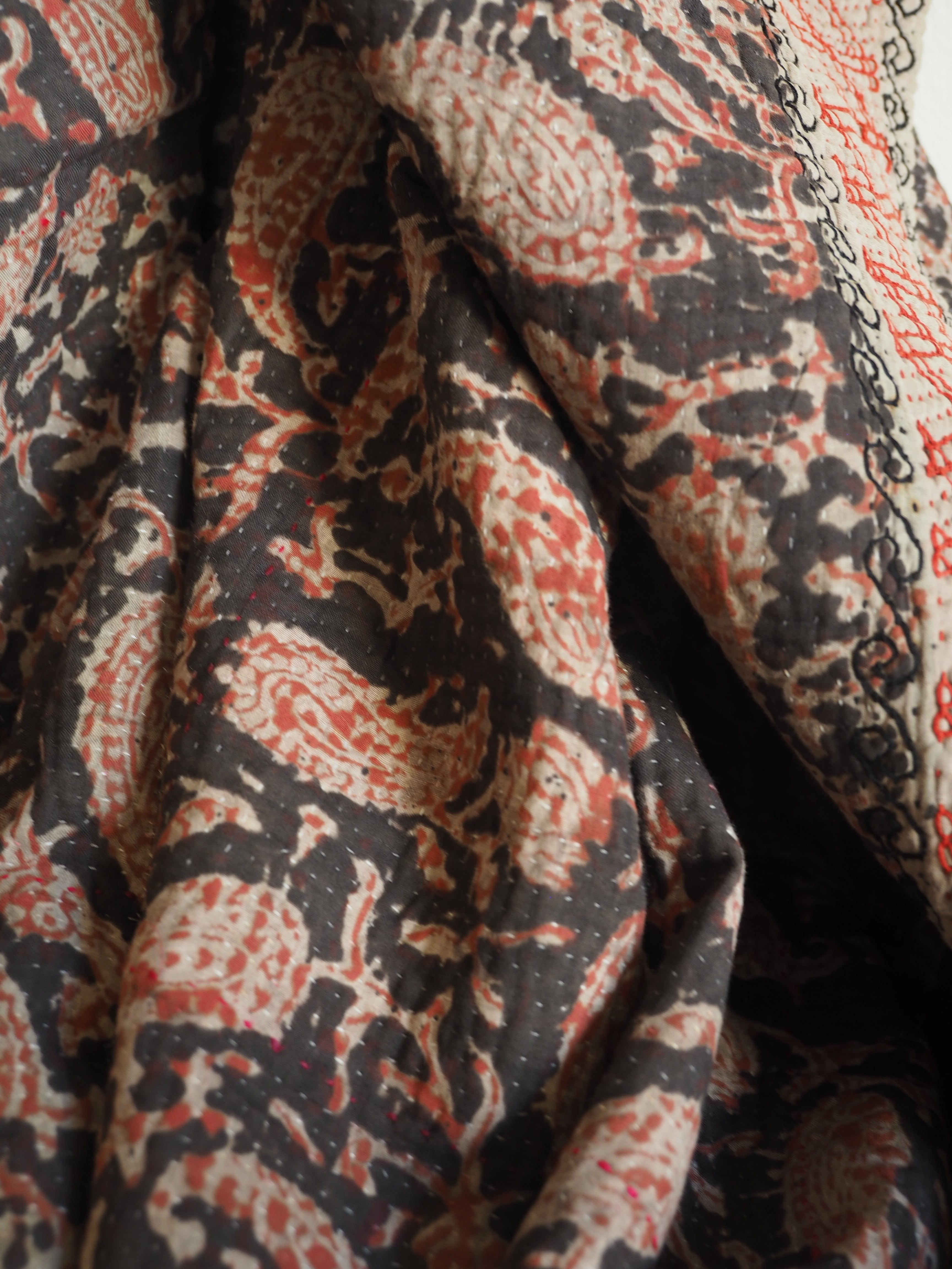 刺し子や刺繍が素晴らしいヴィンテージホワイトカンタに、バグルーブロックプリントを施した手の込んだ美しいカンタです。
